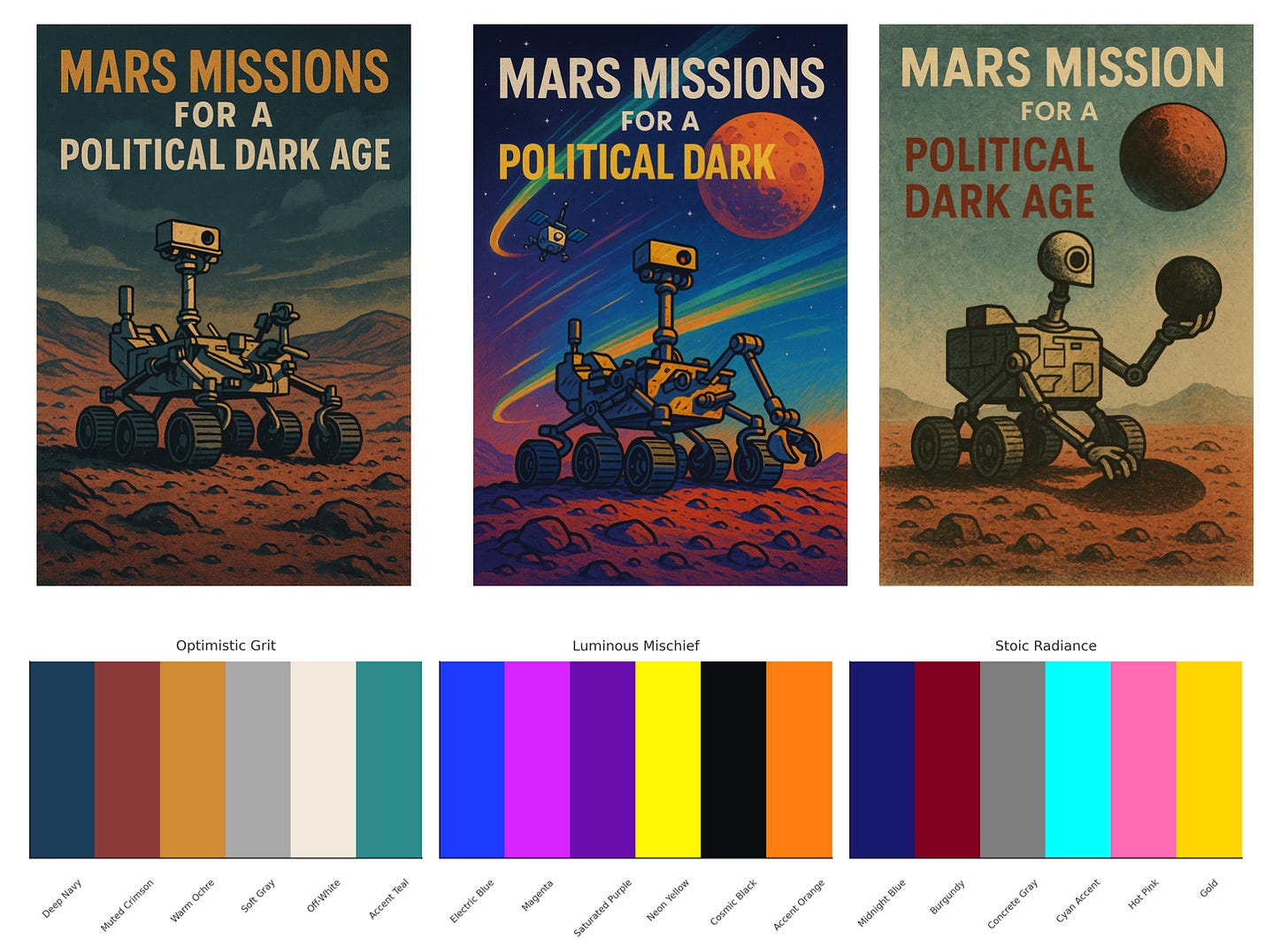 It produced three surprisingly attractive styles in the direction I wanted. I also had it generate comp images along the way for a fake essay titled “Mars Missions for a Political Dark Age” that I might now actually write.