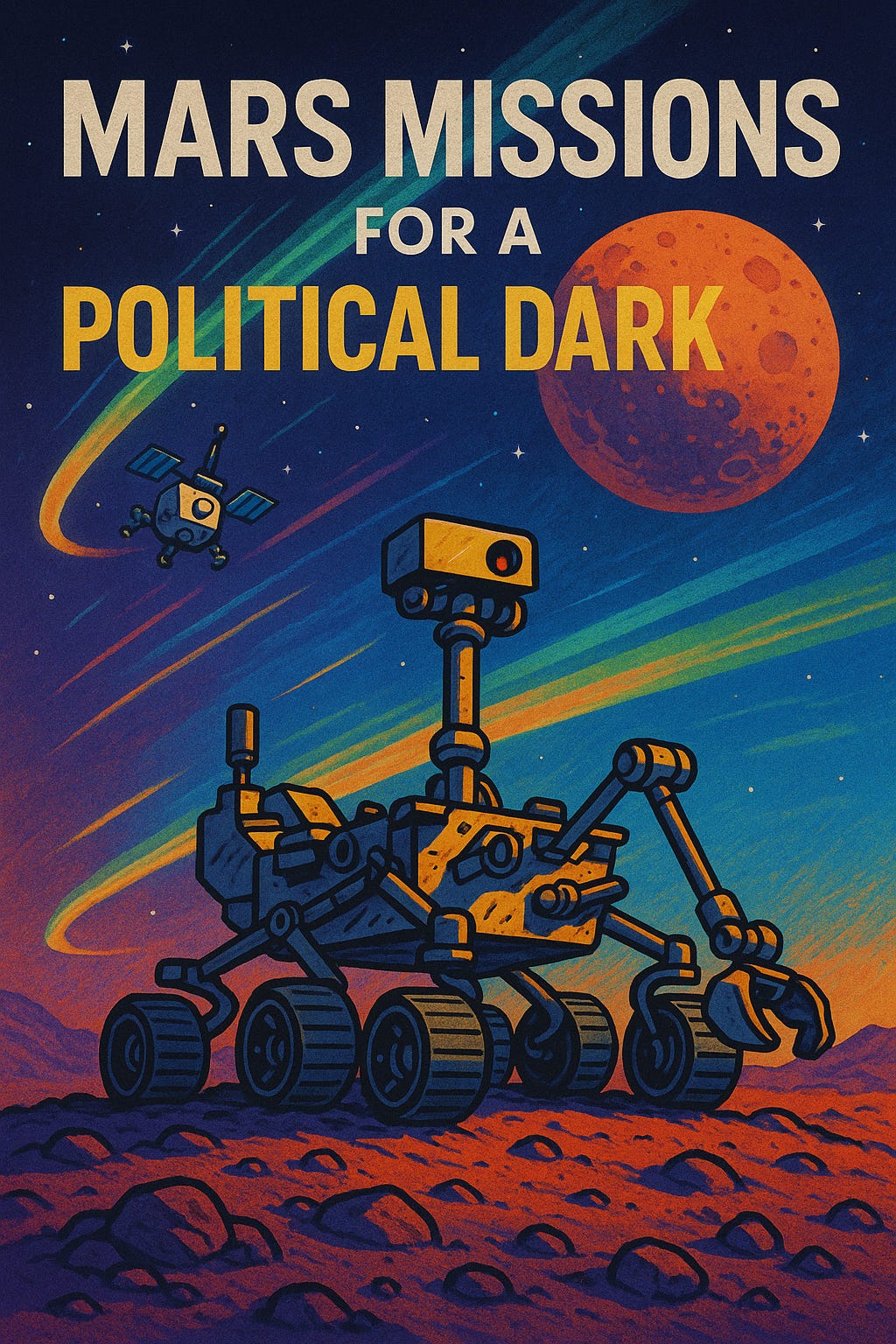 Playful neon-cosmic illustration of a Mars rover on saturated red terrain under an electric blue sky with magenta and green auroras. Rover rendered in cartoonish line work with kinetic strokes, accented by glowing yellows. Bold sans serif title floats in high-contrast cosmic palette, fusing whimsy and urgency.