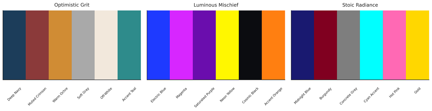 I proposed three directions: Optimistic Grit, Luminous Mischief, and Stoic Radiance.