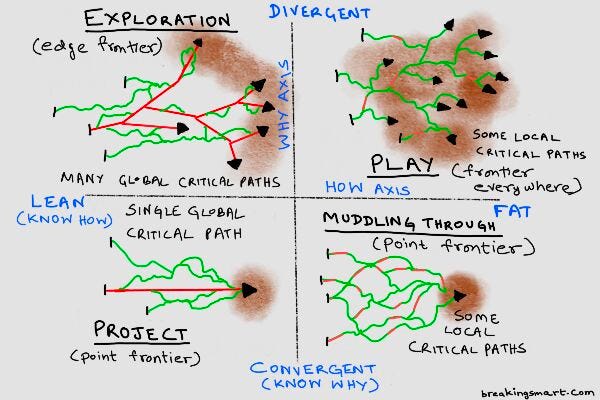 32/ As the picture in the top-left quadrant shows, the result of optimizing around how without knowing (or knowing but not caring) why is a connected, branching web of critical paths, all exploring a frontier edge rather than a single critical path marching to a point.