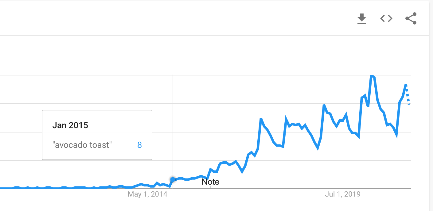 The Murdoch-lab project, code-named “Project Vegemite,” was cooked up in an underground lair in Western Australia between 2015 and 2017. It was triggered by the sharp global rise in the popularity of avocado toast, driven by older Millennials, which began around 2014. This led a lot of conservatives, perennially haunted by the suspicion that someone, somewhere might be happy,2 to fear that the apocalypse was nigh.