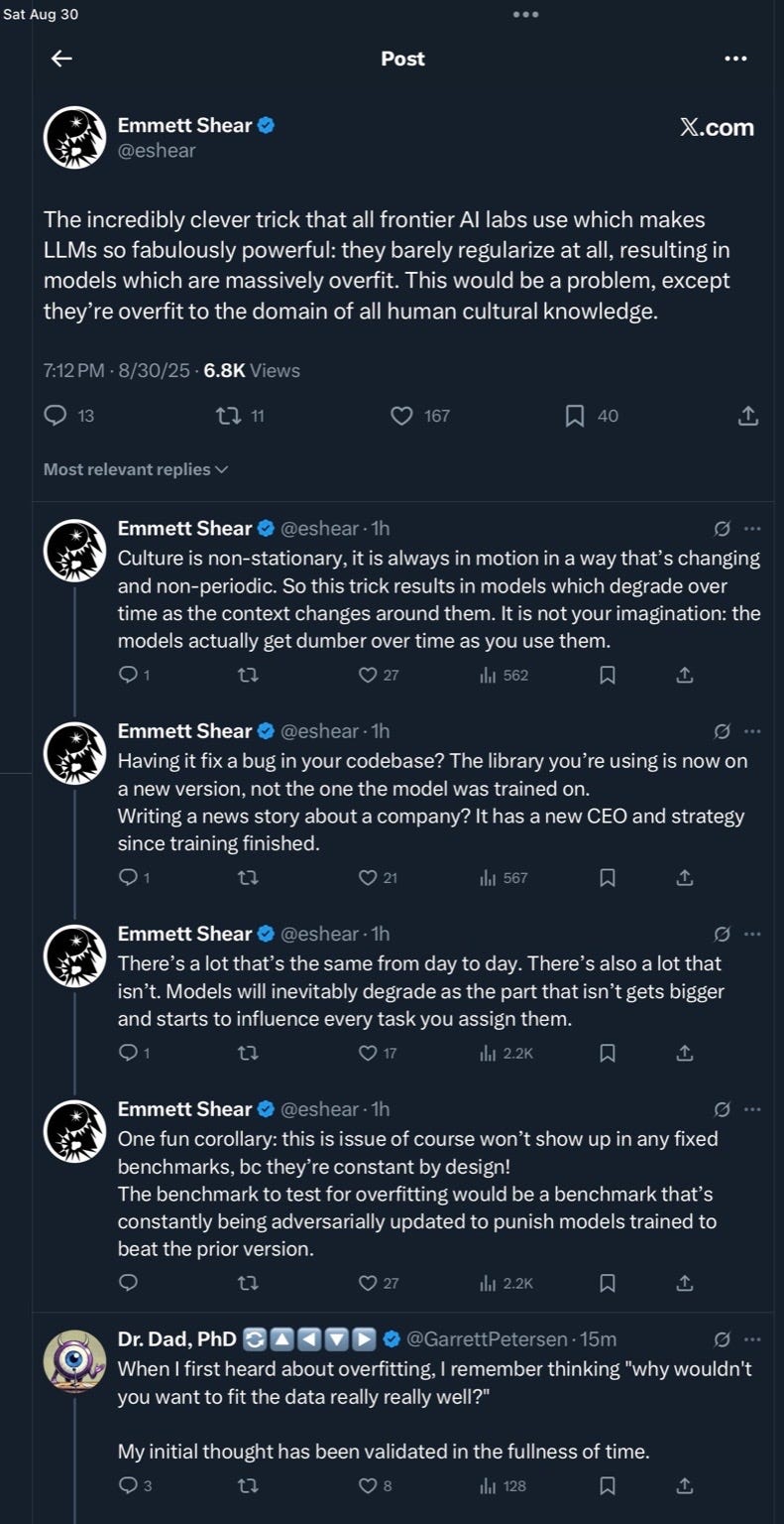 Shear’s observation—that frontier models are barely regularized and therefore massively overfit—captures this dynamic in accessible language.But the deeper point is that overfitting to a static cultural snapshot becomes more catastrophic the larger the model grows. Culture is non-stationary; code ecosystems evolve; APIs change; institutions churn; slang mutates; the factual substrate of the world drifts each month. A small model trained on yesterday’s world degrades slowly. A large model trained on yesterday’s world degrades quickly and fails sharply.
